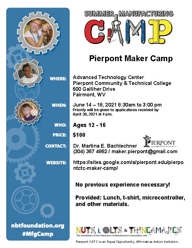 Pierpont Community & Technical College will host a Summer Manufacturing Camp for youth from June 14-18th at their Advanced Technology Center in Fairmont, West Virginia.